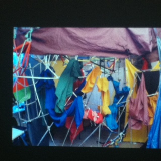 …with materials familiar in his practice, traversing the colorful fabrics, tubular metal rods, and a great animation video film.