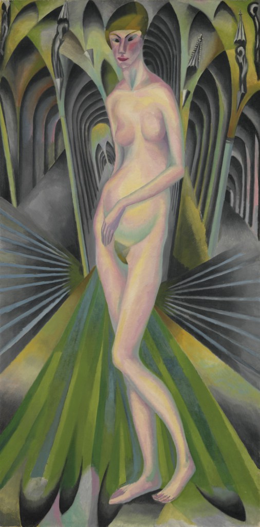 Self Portrtait with Flower” of 1916 is a direct reference to El Greco’s ‘St. John the Baptist’ and ‘Female Nude in Architectural Setting’. These are narrow, large format figurative pictures that Davringhausen created in 1916. Both of these works were only rediscovered in the mid 1990s. Later defamed by the Nazis as ‘degenerate’, Davringhausen hid them at a friend’ s in Aachen before emigrating to Spain in 1933 and never showed them at exhibitions even after the war. “Female Nude in Architectural Setting” was acquired by the Pinakothek der Moderne in 2014.