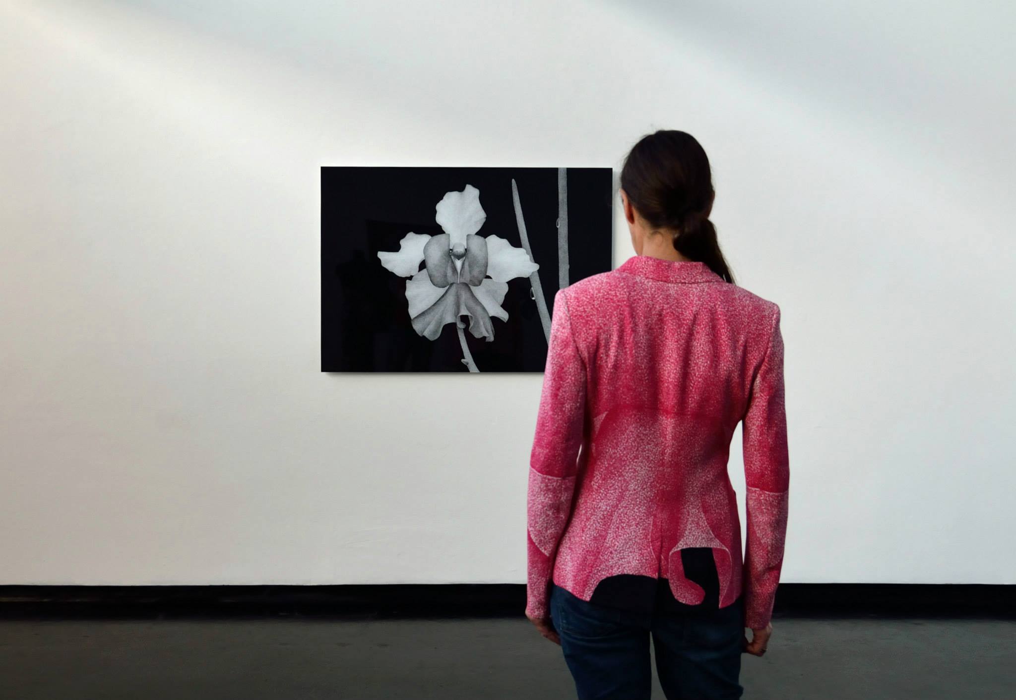 Installation view of „Vanda Miss Joaquim 2“ and visitor with the ESCADA meets THILO WESTERMANN blazer at Thilo’s solo show „Stilblüten“ at Institut für moderne Kunst Nürnberg