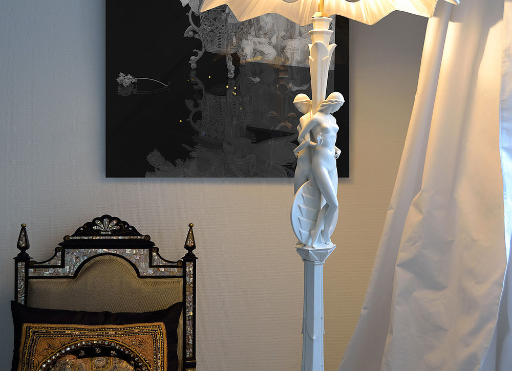 ‘Lilies and card with putto, 2013. Reverse plexi painting, 11.7 x 8.3 ins (29,7 x 21 cm)