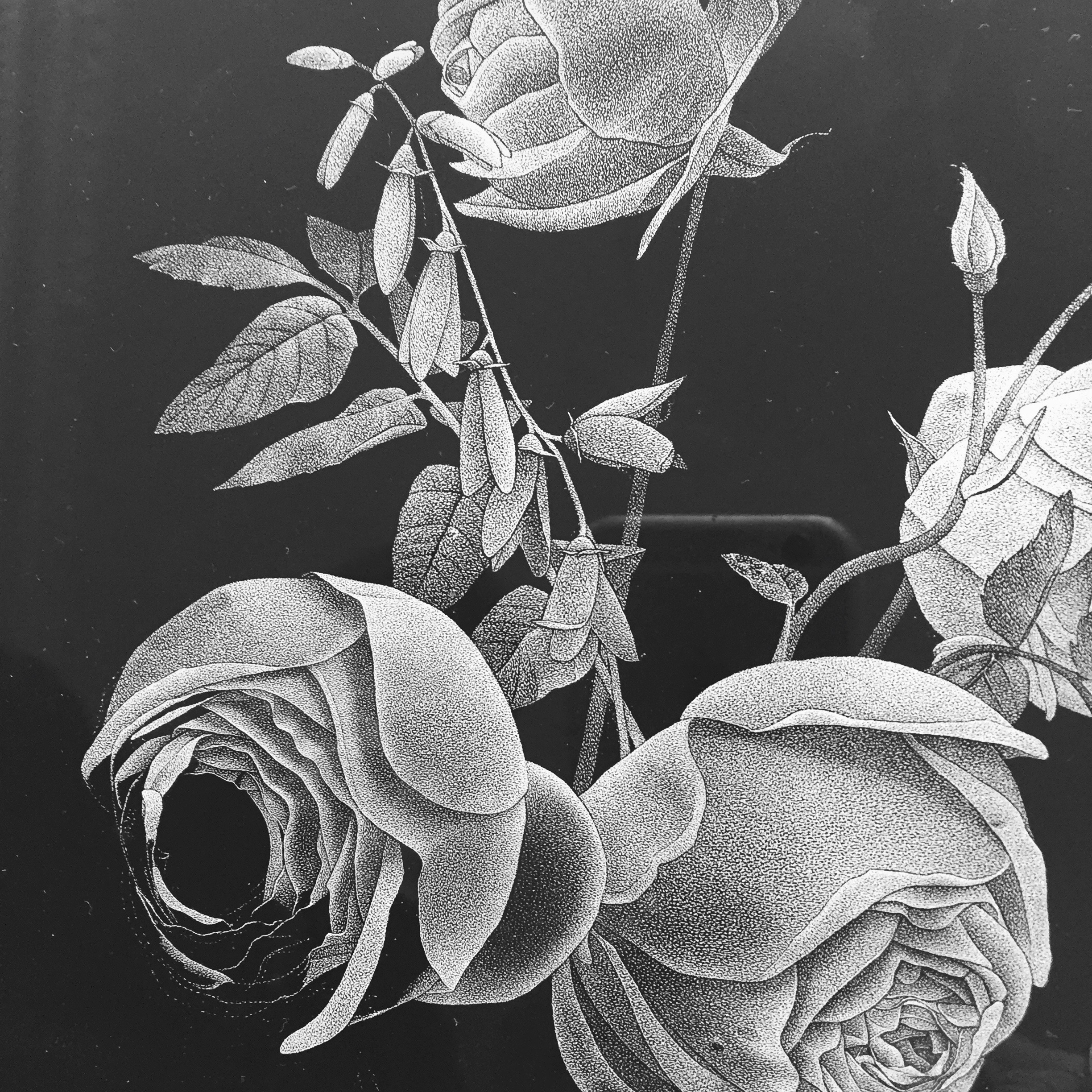 He builds each image from tiny dots he scratches from his blackened surfaces. He makes a minute mark, he repeats the gesture again and again. He continues to do so in lengthy way… this is a weeks-long, detailed process.