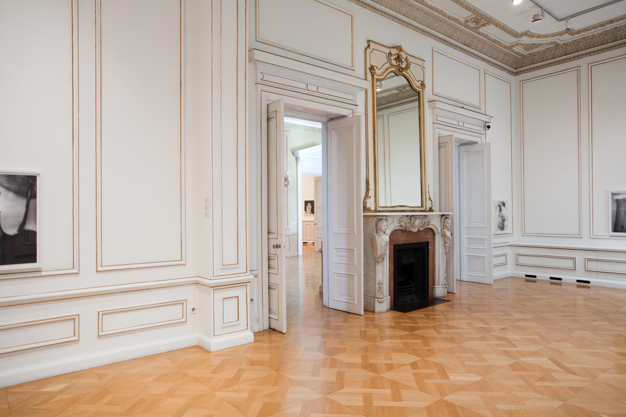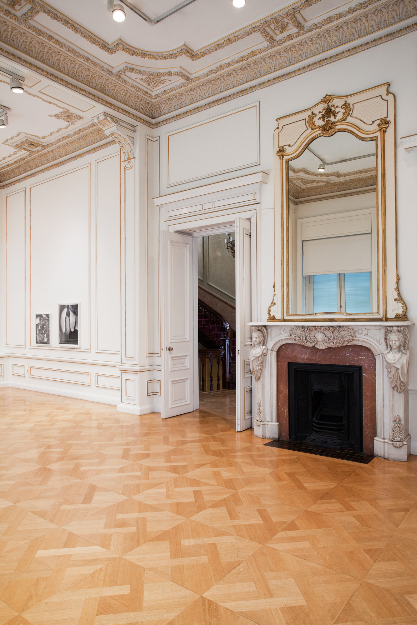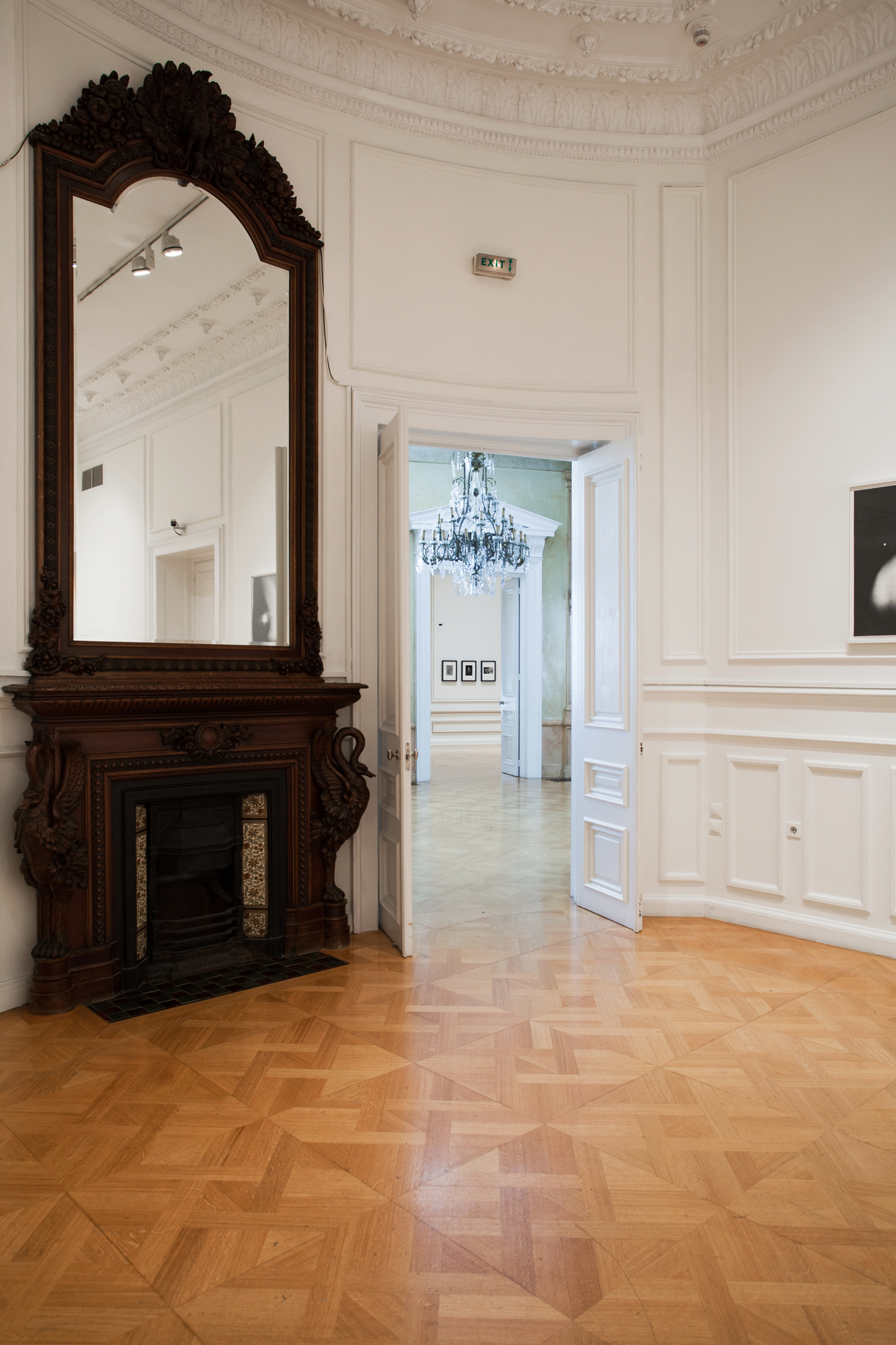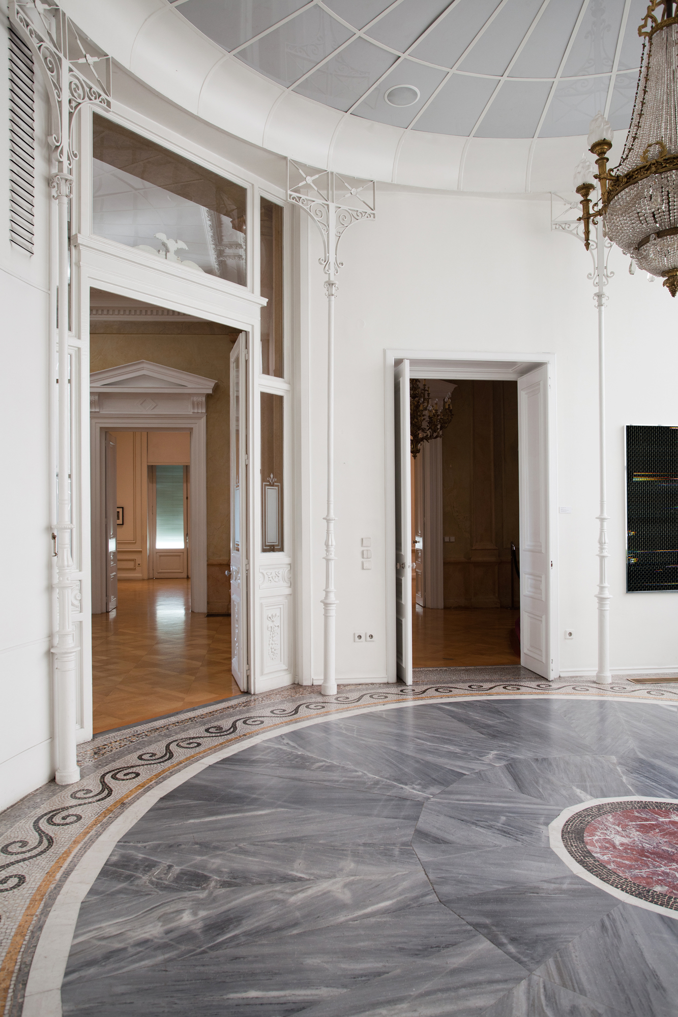 The Stathatos mansion : A marble staircase leads up to the elevated ground floor of the mansion, to the dining room and the main drawing room, as well as a cast-iron rotunda axial to the entrance. No alterations have been made to these rooms, which have retained their original gilded stucco mural decorations, chandeliers, and fireplaces (during exhibitions parts of these are covered by wooden revetments).
