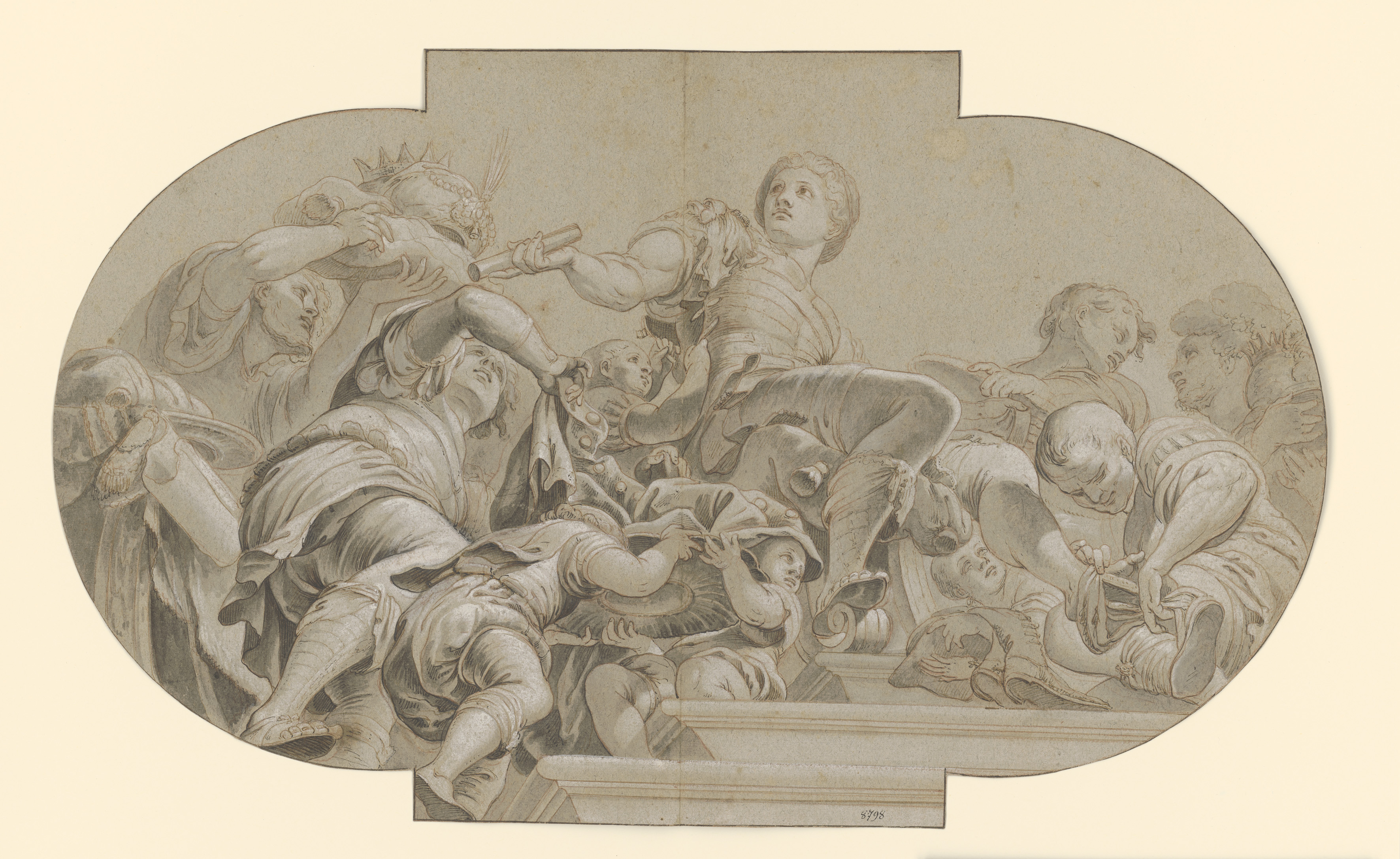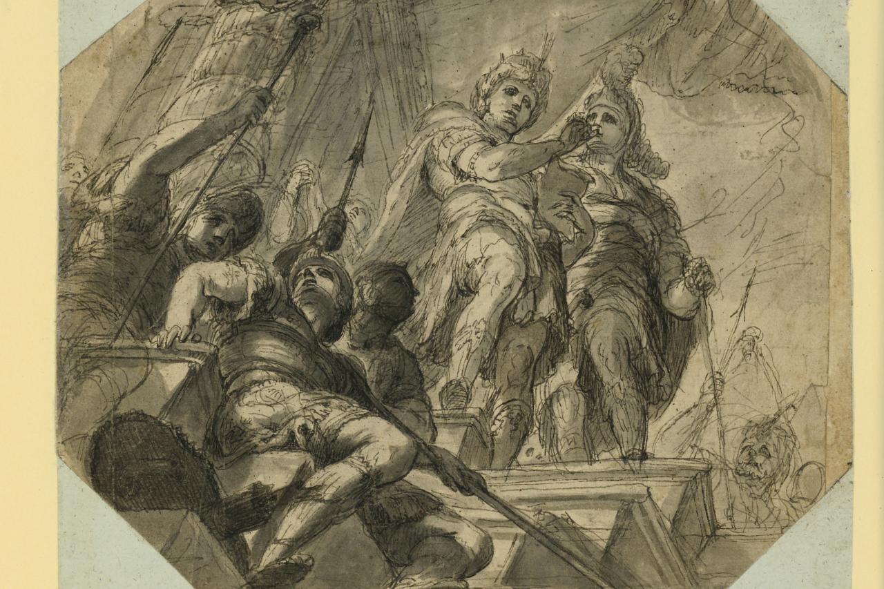 Johann Andreas Wolff, ALEXANDER ZIEHT PERSISCHE KLEIDUNG AN “Alexander wears Persian attire”, design for the ceiling painting (now lost) of the Electoral dressing room in the Munich Residence, around 1680, 341 x 561 mm © Staatliche Graphische Sammlung München