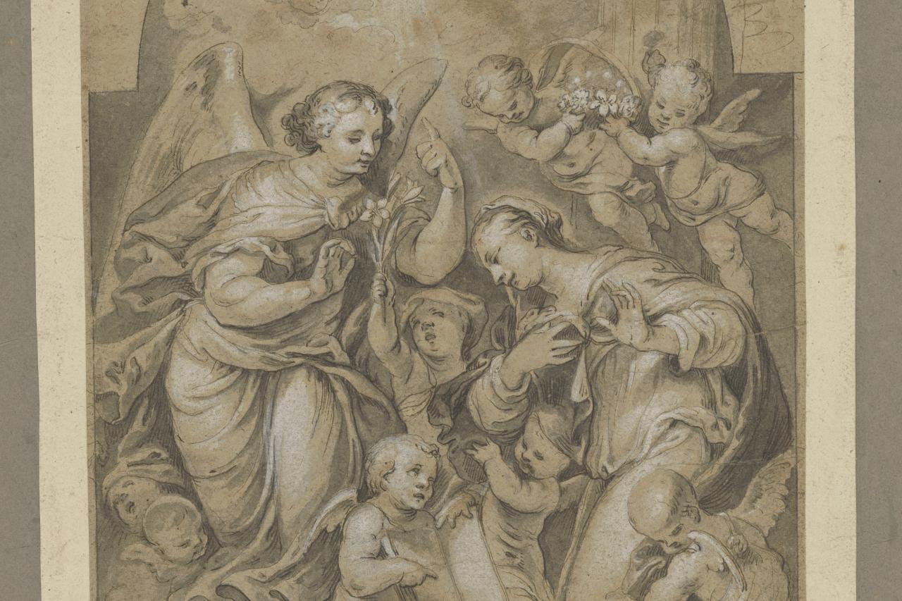 Johann Andreas Wolff DIE VERKÜNDIGUNG AN MARIA “The Annunciation”design for a painting that now hangs in the Diözesanmuseum, Freising, around 1678; pen and black ink, grey wash, heightened with white, on light brow paper, 263 x 179 mm © Staatliche Graphische Sammlung München