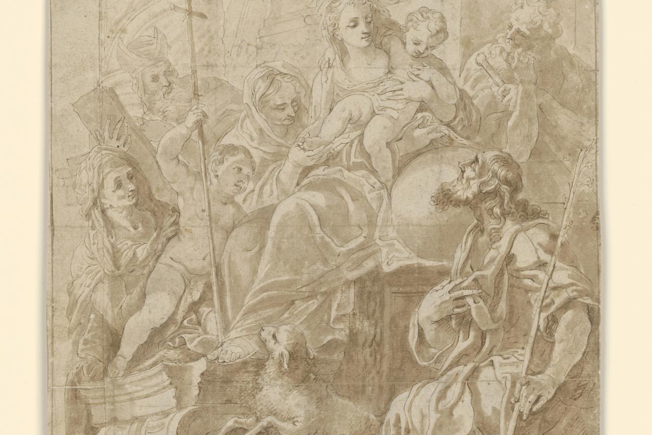 Johann Andreas Wolff DIE MYSTISCHE VERMÄHLUNG DER HL. KATHARINA, “The Mystic Marriage of St. Catherine, around 1692; Pen and brown ink, coloured wash, 309 x 215 mm