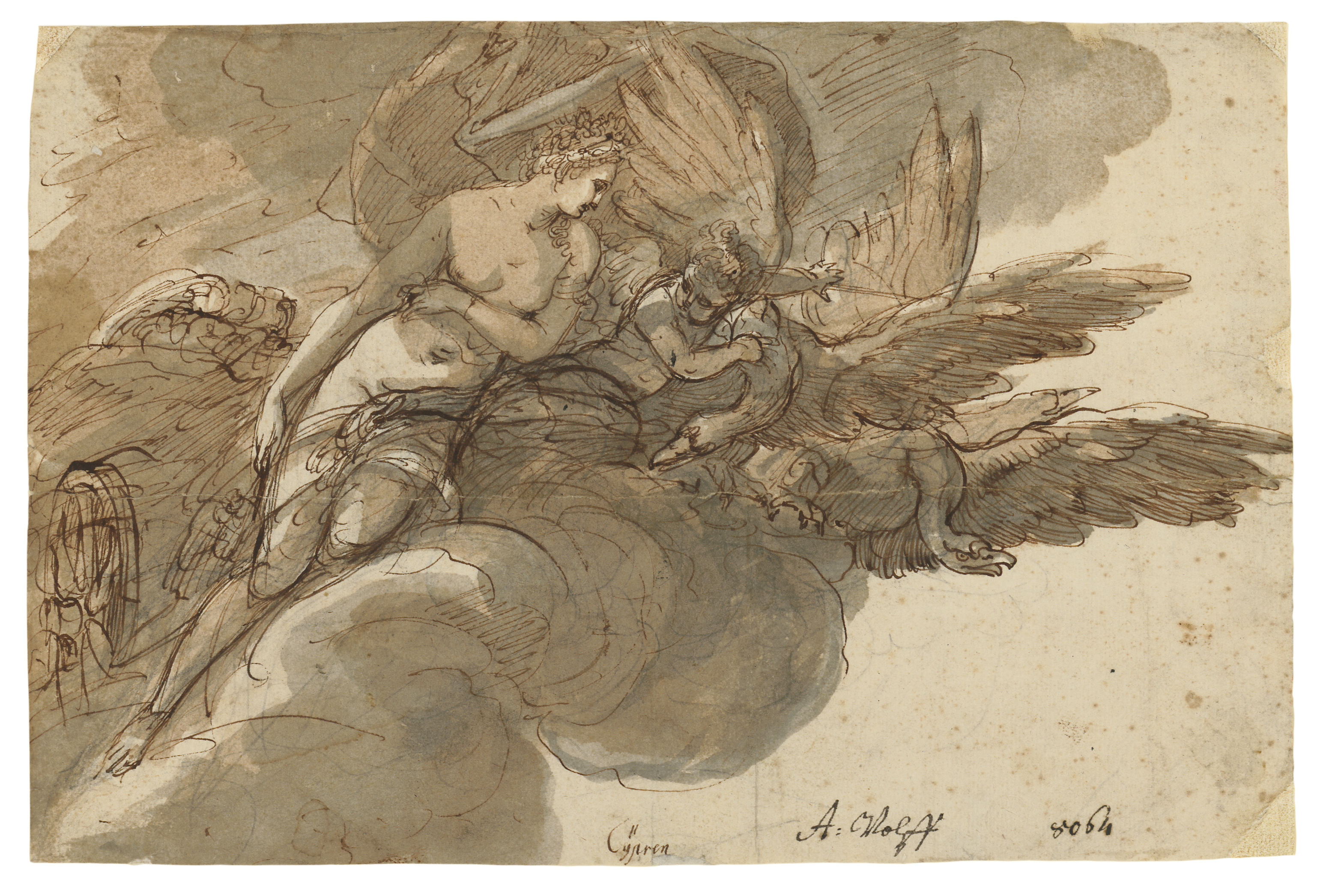Johann Andreas Wolff, VENUS UND AMOR AUF EINEM VON SCHWÄNEN GEZOGENEN HIMMELSWAGEN “Venus and Cupid on a heavenly chariot drawn by swans, design for the ceiling mural in the Munich Residence, around 1692; pen and red-brown ink, grey and light brown wash, over graphite 161 x 250 mm © Staatliche Graphische Sammlung München