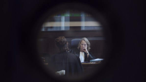 Palais de Justice was filmed surreptitiously at the Palais de Justice in Brussels, a vast 19th century courthouse designed in an ornate late Neo-Baroque style. Contradicting the familiar patriarchal culture of law, Young’s concealed camera depicts female judges and lawyers at court. Sitting at trial, directing proceedings or delivering judgments, female judges are spied through a series of circular windows in courtroom doors.(gallery’s press release).