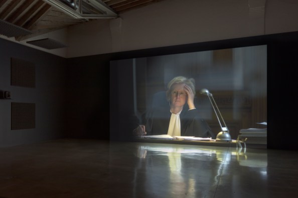Installation view, Carey Young, Palais de Justice,2017,single-channel HD video (from 4K); 16:9, color, quadrophonic sound;17 mins 58 sec,Photo: Steven Probert © Carey Young. Courtesy Paula Cooper Gallery, New York