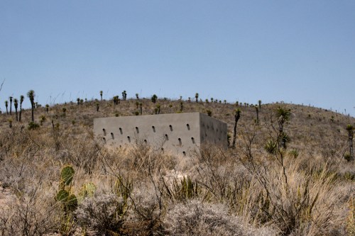 ‘Blue Oasis’, San Luis Potosi, Mexico, 2011. Permanent collection Sculpture Park San Luis Potosi. (Detail wall perforation looking to the desert from inside main space;photo ©Karin Waisman