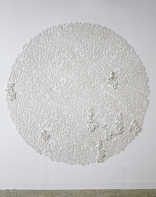 Karin Waisman’ work refers to 17th Century needlepoint, the craft involving lace making by embracing potentially infinite growth forms, ornamentation generated through a painstaking process. (Olivier Berggruen essay ‘Efflorescence & Evanescence’ at the book/ cataloge ‘Karin Waisman – The Garden of Eden’, New York, 2004)