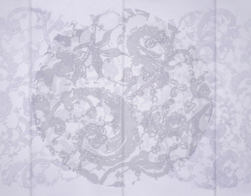 Karin Waisman creates haunting, ethereal works in which ornamentation acts as a founding principle. Formal elements alternate between refined vegetal motifs and a proliferation of geometric patterns. These unfold effortlessly across a flat surface that is primarily dynamic rather than static. The expansion of geometric forms occurs in a spontaneous, organic fashion that undermines the Pythagorean ideal on which they seem to be based.