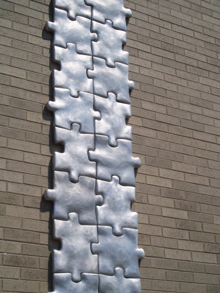 Karin Waisman -Puzzled, 1998-1999 (detail) Cast Aluminum 432″h X 24″w x 2″d. Permanent Collection Plattsburgh Sculpture Park. Myers Fine Arts Building;photo ©Karin Waisman