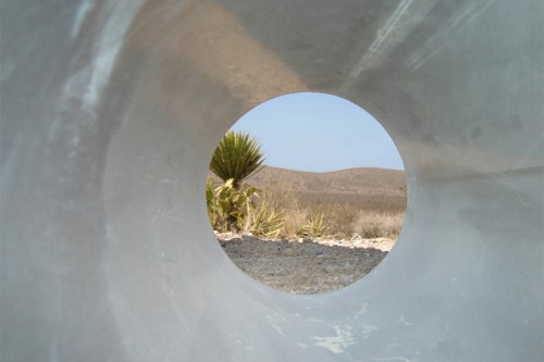 Blue Oasis is a partially buried concrete structure, fifteen feet square and twelve feet high on the inside. We enter by descending a narrow and dark stair, a transitional space that leads to a large tiled cubic room. All the walls, floor, and ceiling are covered with a square encaustic tile that is patterned with concentric circles in blues and greens. A stainless steel tube penetrates some of these circles to the outside, allowing for natural light and ventilation as well as serving as a small oculus that allows the viewer to see the desert landscape beyond. Working within this extreme site, Blue Oasis exists for the viewer to establish a temporary dialog with Nature through the lens of the vibrant blue light that pulsates within. It transforms the landscape from within. On the outside it blends with the desert landscape, half- buried in the land. (Karin Waisman, April 2013)