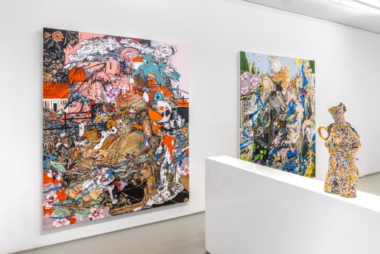 …DiMattio returns to the aesthetics of craft for inspiration, metamorphosing traditional techniques and imagery into mad-cap mise en scenes. Boucherouite, the exhibition title, refers to the rag rugs traditionally made from torn and reused clothing by Berber women in North Africa. In a nod to their improvisational and idiosyncratic style, DiMattio shreds and weaves together images from many centuries and cultures, turning them into a new hybrid form. (Boucherouite exhibition, salon 94, NY, gallery press release)