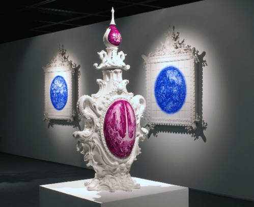 As in her painting, in her ceramic work, DiMattio follows the principles of stitching together pieces of fragments of histories and traditions to create multivalent forms and images that connect diverse sculptural and decorative languages around ideas of value, function, gender, and class. References to decorative wares such as Anatolian Iznik, Chinese Ming Dynasty porcelain, and Dutch Delftware abound alongside allusions to the output of the German factories Meissen and Augarten, the French Du Paquier and Sèvres, and the English Derby, Minton, and Wedgwood. (Claudia Schmuckli “Digital Becoming”, published in DiMattio book, Blaffer Art Museum, University of Houston)