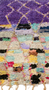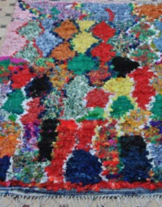The Boucherouite rug is a magical colorful work of art, made by the Berbers in Morocco, Boucherouite or Boucherwit, from Moroccan Arabic ‘bu Sherwin’ ( a piece torn from pre-used vintage clothing scrap )
