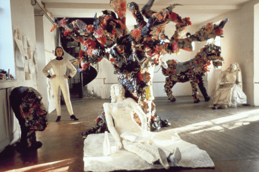 Niki de Saint Phalle in her studio at Soisy, surrounded by Le Mangeur d’Enfants, La Mariée sous l’Arbre, and Le Cheval et la Mariée. Photo: © Monique Jacot Copyright © 2007-2018 Niki Charitable Art Foundation