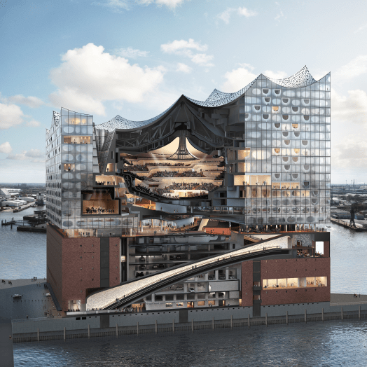 “The Elbphilharmonie takes inspiration from three structures: the ancient theatre at Delphi, sport stadiums and tents”