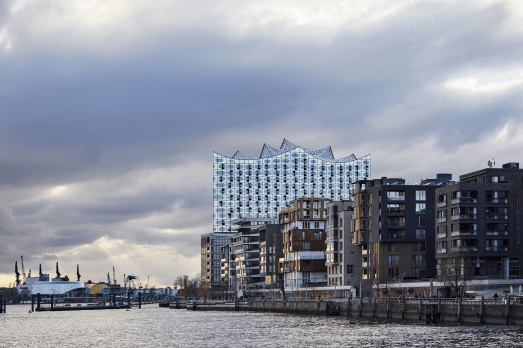 History meets modernity at the traditional port Sandtorhafen in the HafenCity in Hamburg. Approximately up to 25 historical vessels can dock along th380-meter long pontoon area of Hamburg’s first artificially built port basin. Somewhere here at the edge the ElbPhilarmonie stands spectacularly with its impressive glass facade and the wave-like rooftop rises up from the former Kaispeicher building on the western tip of the HafenCity. It is been rated as one of the largest and most acoustically advanced concert halls in the world.