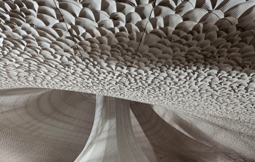 The described “white skin” that covers the surface of the walls and ceilings in the Grand Hall is composed of approximately 10,000 sheets of gypsum fiber panels. With the help of an expansive reflector that is suspended from the middle of the vaulted ceiling, the panels project sound into every corner of the space.’ …The 10,000 panels coalesce into a billowy, off-white skin, punctuated only by 2,150 seats and 1,000 hand-blown glass light bulbs…. beauty was only part of the architects’ intention when they began designing the building more than 13 years ago. “Every panel has a function,” says Benjamin Koren, founder of One to One, the studio that worked with Herzog and De Meuron to design and fabricate the panels.’