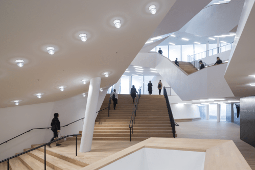 Concertgoers can access the Grand Hall and Recital Hall foyers via stairs and lifts from the Elbphilharmonie Plaza. The Grand Hall foyer clearly defines the character of the Elbphilharmonie architecture with stairs that extend over several floors; 1,000 curved window panels, tailor-made to capture and reflect the color of the sky, the sun’s rays, the water and the city, turn the concert hall into a gigantic crystal.