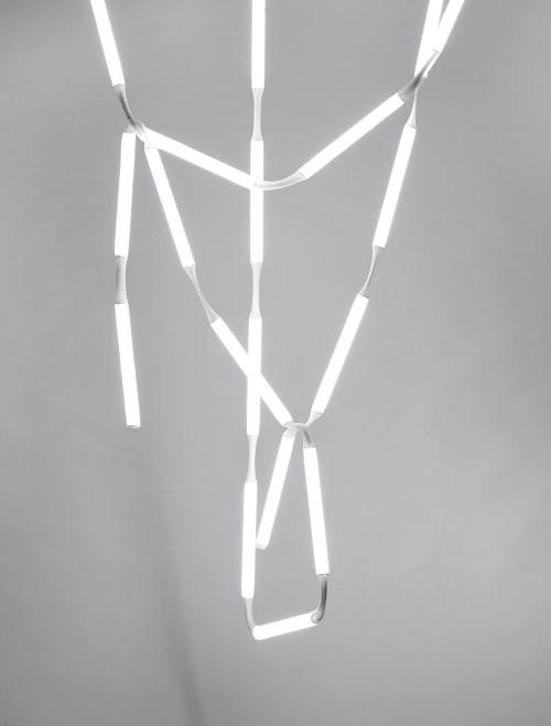 Burr’s sculptural composition entitled Women Who Work consists of a group of IKEA chairs facing away from a printed aluminum panel featuring a textile design by Joseph Albers. Burr positioned a book called “Women’s Work: Textile Art from the Bauhaus” is open on one of the empty chairs, suggesting maybe an absent audience.